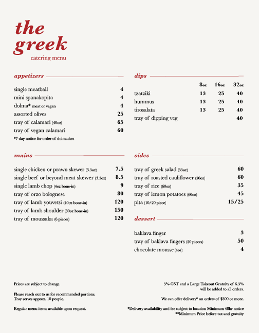 5% GST and large gratuity of 6.5% will be added to all orders. Delivery available within Vancouver (minimum 48hr notice) for orders over $300 or more, subject to availability.