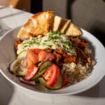 cucumber salad, long grain rice, gyro meat, fresh grilled pita and hummus