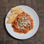 five hour braised lamb shoulder on a bed of orzo pasta with homemade tomato sauce and shredded saganaki cheese. served with fresh grilled pita and tzatziki