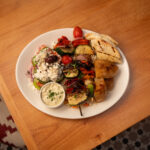 – One or two skewers of your choice, tzatziki and fresh baked pita (chicken thigh or tiger prawn) +8/+14